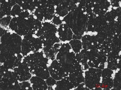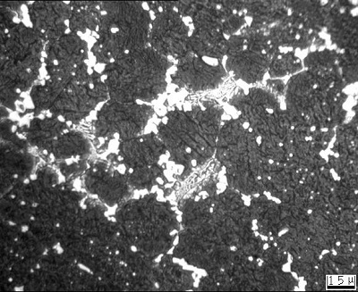 過(guò) 燒 在金相組織中晶界上出現(xiàn)萊氏體共晶組織,并呈塊狀或半網(wǎng)狀分布(圖2),還有可能出現(xiàn)黑色組織。